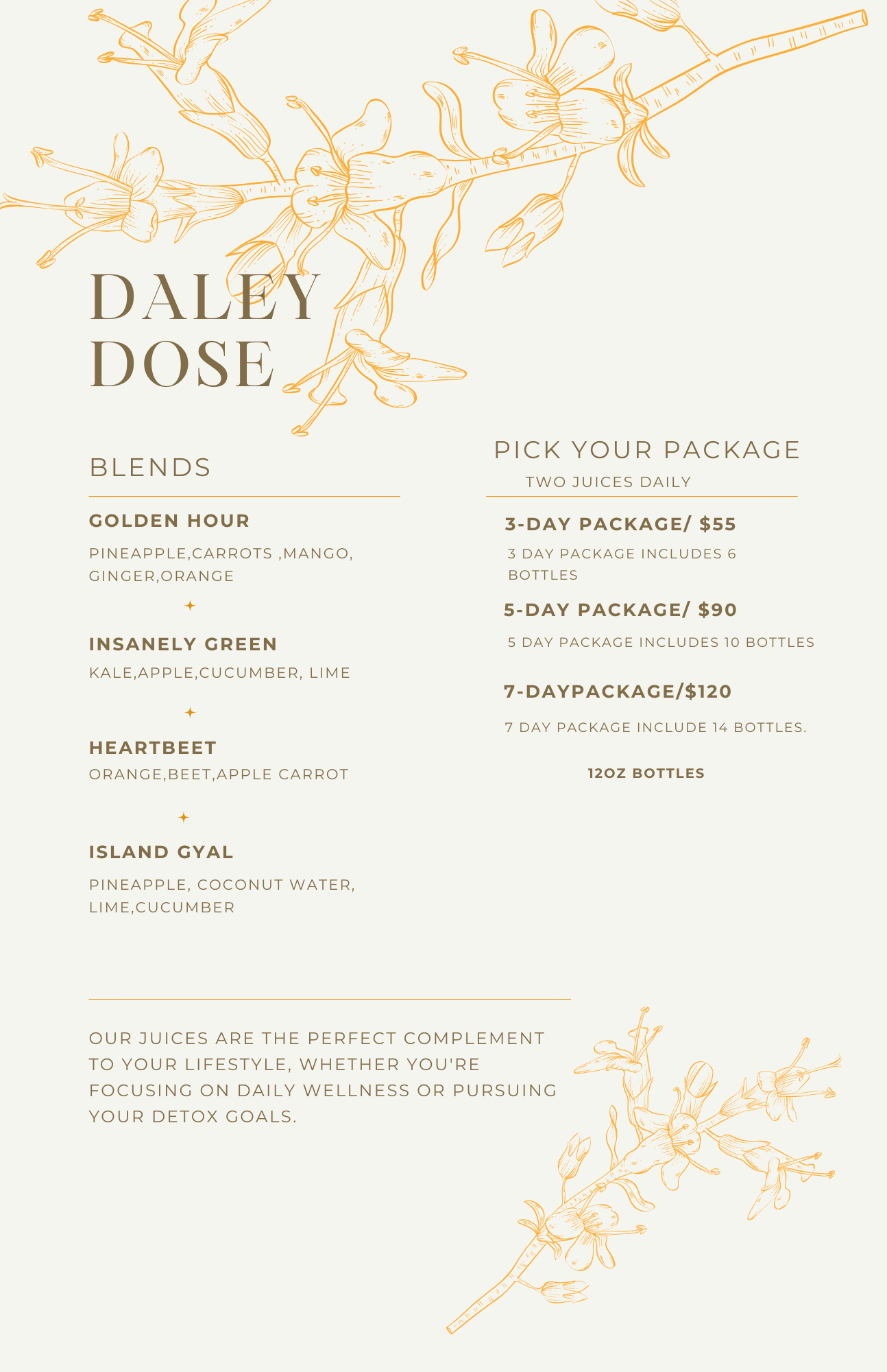 At Daley Dose, we’re all about making wellness effortless and delicious. Our mission is simple: to fuel your day with nutrient-rich, cold-pressed juices that taste as good as they make you feel.